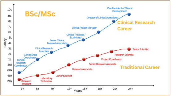 Compared to conventional roles, clinical research offers a more structured hierarchy with leadership roles that are often recognized and compensated earlier. The graph clearly shows that salaries in clinical research tend to be higher than conventional science roles at almost every stage.