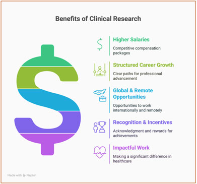 Clinical research is the backbone of modern medicine. It involves designing, conducting, and analyzing clinical trials that test new drugs, treatments, and therapies. Working in this field means you’re directly contributing to healthcare innovation and patient safety. These studies ensure that treatments are safe and effective before reaching patients. Through well-designed trials, researchers generate reliable data that helps shape medical practices, improve patient care, and lead to medical innovation. But beyond the noble purpose, clinical research offers financial benefits, structured career growth, and numerous opportunities to excel globally. It’s a field where your expertise can truly make an impact—and be well rewarded for it.